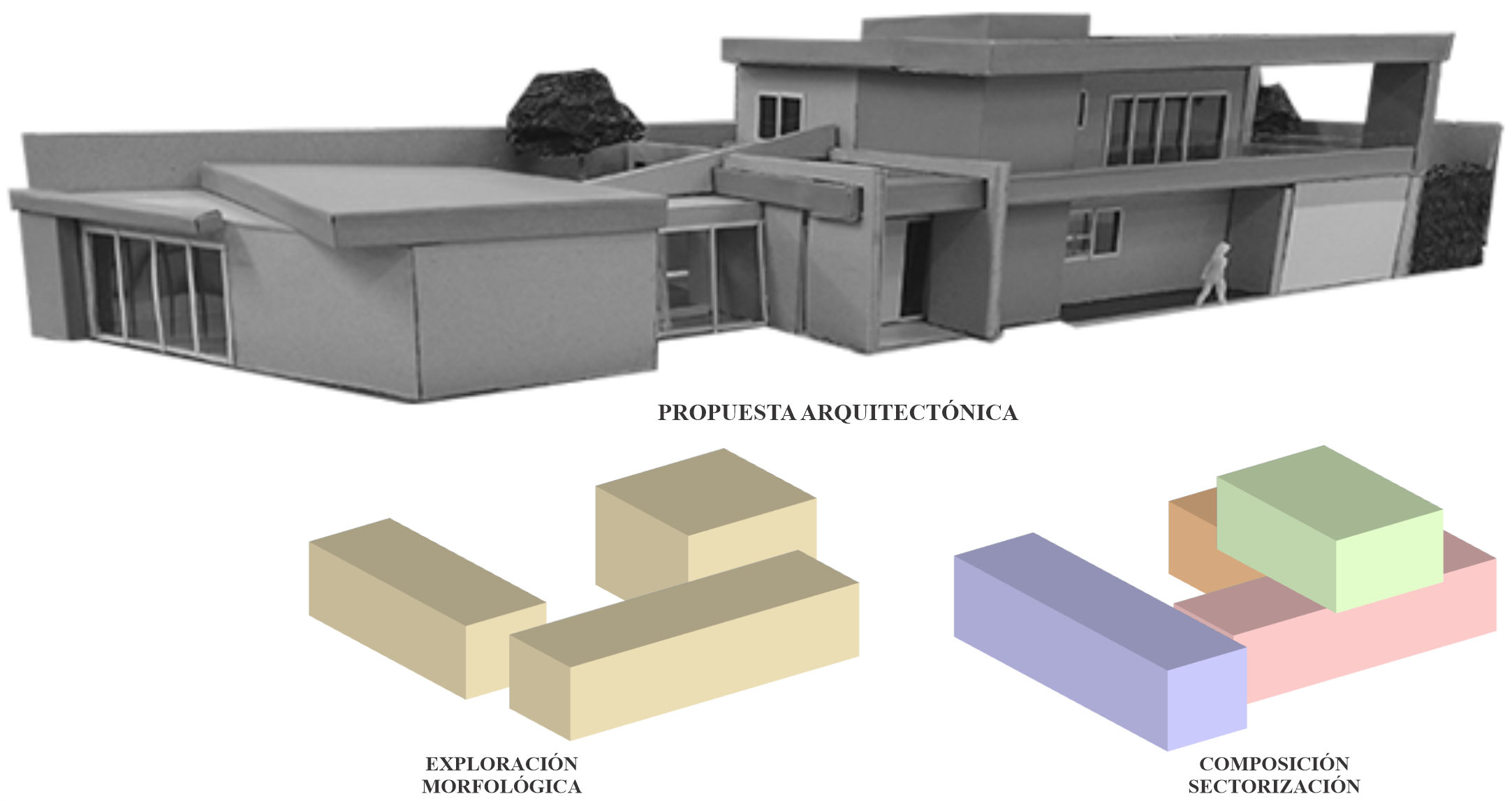 La distinción clara entre la jerarquía de los diferentes espacios toma significativa relevancia gracias a las relaciones de proporcionalidad de cada entidad junto al lenguaje empleado en los planos horizontales y verticales que los identifican como conjunto. Se pueden emplear elementos compositivos, como placas o barras que vinculen los distintos cuerpos, pero lo que predomina es la relación proxémica entre ellos, la cual es una herramienta clave para insinuar una posible jerarquización y comunicar cómo funciona la vivienda, cuáles son los espacios más importantes y de qué manera se articulan con los demás sectores.