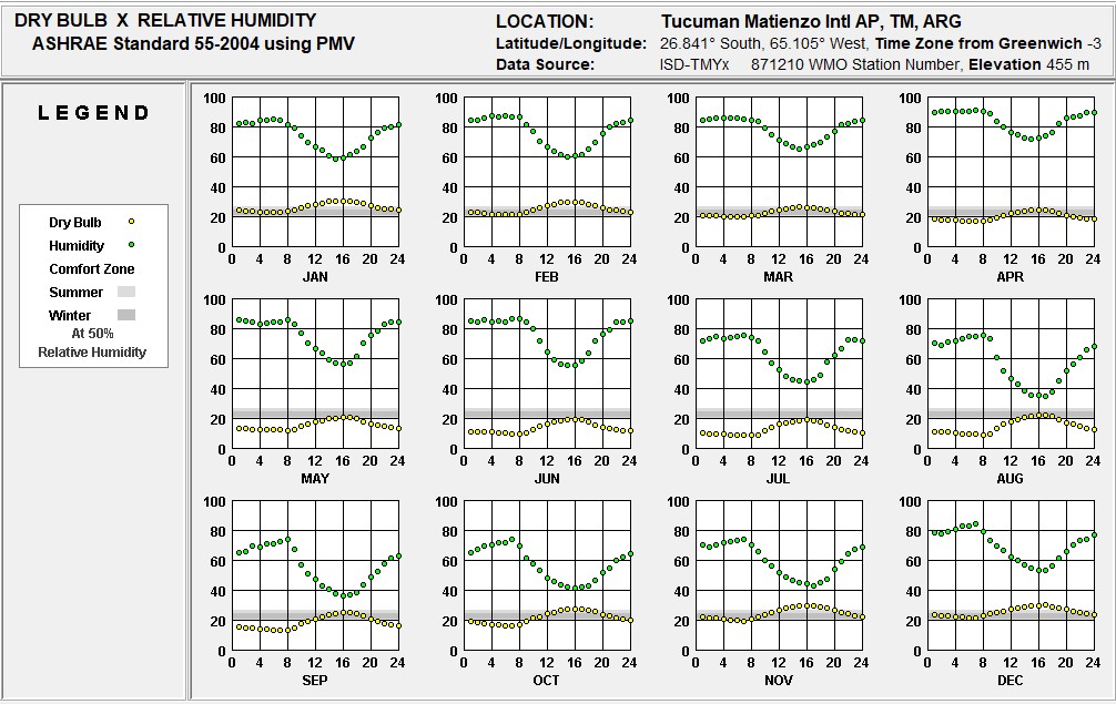 Se obtienen, por un lado, los datos climáticos procesados a partir del software de cálculo y graficación Climate Consultant 6.0 y datos climáticos en EPW (Energy Plus Weather) obtenidos a partir de Climate.Onebuilding. Estos corresponden a la estación meteorológica AERO, ubicada en el aeropuerto de la ciudad de San Miguel de Tucumán, en las afueras de la misma. Se registran, durante el período estival, temperaturas medias que superan los 30 °C y llegan hasta los 38 °C. Durante el período invernal se observan temperaturas inferiores a los 10 °C. Se registran mayores amplitudes térmicas para el invierno que para el verano. En la Figura 1 se observa que, entre los meses de septiembre hasta marzo, en promedio, la temperatura cercana a las 12 h del mediodía está siempre por encima de la zona de confort. En los meses restantes es al revés, y en horarios cercanos al mediodía la temperatura media se encuentra dentro de la zona de confort, mientras que el resto del día está por debajo.