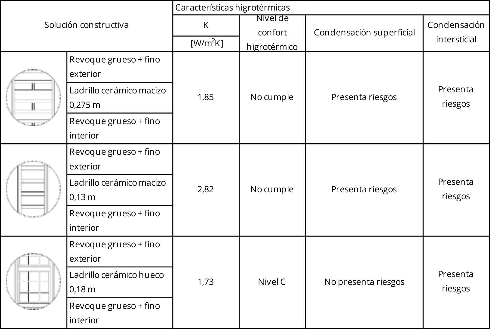 La solución constructiva adoptada para techo es la misma en todos los casos: chapa con cielorraso suspendido, cámara de aire ventilada y lana de vidrio de 0,05 m sobre cielorraso. En el caso de los muros exteriores, se detectan tres tipos: ladrillo macizo de 0,30 m, ladrillo macizo de 0,15 m, y ladrillo hueco de 0,18 m, todos ellos revocados en ambas caras; también se observan combinaciones de estos tipos. En todos los casos se encuentran terminados exteriormente con pintura color claro entre marfil y beige. En la Tabla 2 se explicitan las principales características higrotérmicas de las soluciones existentes según normas IRAM, se pueden observar coeficientes de transmitancia térmica K, nivel de confort higrotérmico (IRAM 2002) y riesgos de condensación superficiales e intersticiales (IRAM 2000). Se advierte que ningún caso cumple con el nivel recomendado (nivel B) y que en todos se presentan riesgos de condensación intersticial.