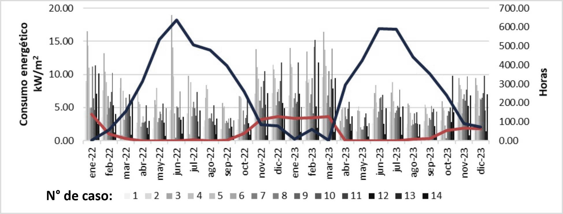 En el gráfico expresado en la Figura 3 se exhiben los datos de consumo por m2 en el eje principal y con columnas. En contraste, el eje secundario muestra las horas y con líneas la cantidad de horas en que la temperatura se encuentra por debajo de 18 °C y aquellas en que resulta superior a 32 °C.