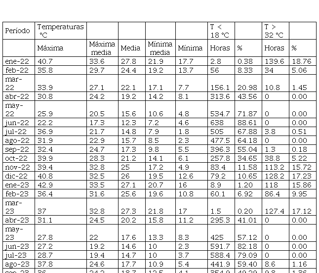 Por otro lado, se analizan los datos de una fuente local, la EEAOC, estación meteorológica El Colmenar, de la cual se obtienen datos promedio diarios para un recorte temporal específico. Se contemplan los últimos dos períodos, años 2022 y 2023, se analizan particularmente los datos de temperaturas media (máxima, media y mínima). La fuente consultada cuenta con un dato particular, que es la cantidad de horas en las que la temperatura es superior a 32 °C e inferior a 18 °C. En la Tabla 1 se expresan los valores mencionados anteriormente y de ella se extrae que los meses más cálidos, en el período analizado, van de octubre a marzo, y que los restantes resultan los más fríos.