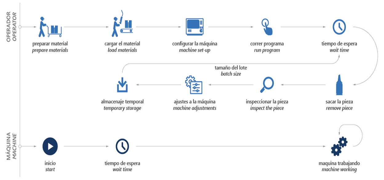 Las primeras cuatro tareas enlistadas en la tabla anterior: preparar material, cargar material, set-up de la máquina y preparar y correr el programa se realizan una única vez por lote de producción mientras que en las dos últimas su tiempo total depende del número de piezas por lote.
