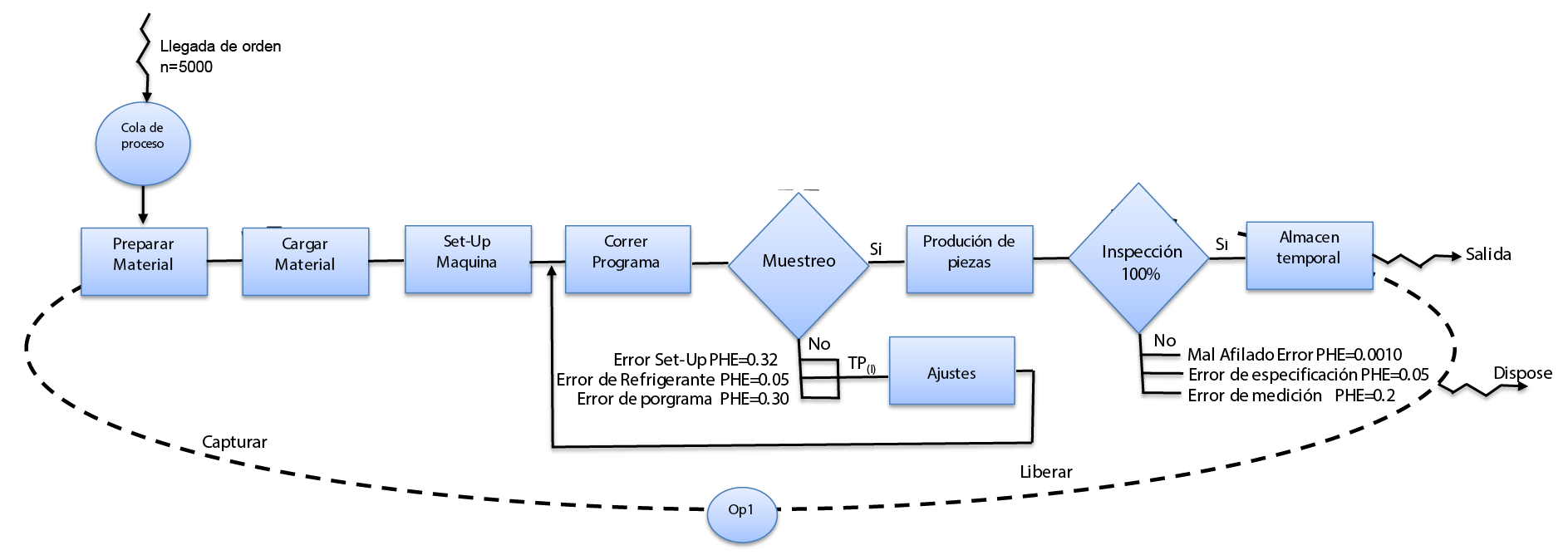 Para el modelaje de las operaciones se establecieron las variables de tiempos de proceso con su respectiva distribución de probabilidad, para esto se tomó una muestra de tiempos de 30 observaciones para cada operación. En la operación de torno se identificaron los errores humanos y se clasificaron con base a la norma NTP 620, (Sureda, [11] en errores de omisión y en errores de acción; éstos últimos se derivan en errores de selección, error de secuencia, error temporal y error cualitativo. A cada error se asignó un número de probabilidad basado en la metodología THERP, según la norma NTP 620 [18], para determinar las probabilidades de error en las diferentes tareas de la operación de torno. El flujo lógico del modelo se construyó en el software licenciado Arena 14.7.