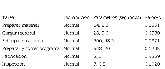 Para un lote de 5000 unidades del total de tiempo promedio de fabricación se consumen un 39% en labores de preparación, carga de material e inspección las cuales son desarrolladas por el operario. Las pruebas de bondad de ajuste se realizan para un nivel de significancia de 0.05, los valores obtenidos muestran que los tiempos en las diferentes operaciones tienen un comportamiento normal como se muestra en el cuadro 1.