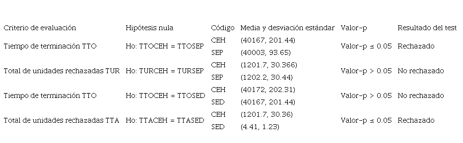 Para el total de réplicas simuladas en el sistema actual se tiene un promedio de tiempo de terminación (TTO) del proceso considerando todos los errores humanos (CEH) de 40167.0 segundos y una desviación estándar del 201.44, mientras que en el escenario con la no presencia del error humano en la etapa inicial únicamente (SEP) se tiene un TTO de 40003.0 segundos y una desviación de 93.65. El valor del estadístico t para la prueba de medias de estos tiempos es de p-value=>0.05 por lo que se rechaza la hipótesis nula, y por lo tanto los tiempos son significativamente diferentes para un 0.05 de significancia. Por otro lado, tenemos que la prueba de medias para el número de unidades rechazadas en estos dos escenarios resulta no ser significativamente diferente para un p-value>0.05. En este caso el error humano no incrementa el número de defectuosas, pero si el tiempo de terminación el cual se traduce en un mayor costo de producción por unidad. Esta información se complementa con el escenario donde se eliminan los errores al final del proceso (SED). La prueba de medias del tiempo de terminación (CEH/SED) muestra que no existe diferencia significativa entre el tiempo de terminación del lote. Si se analiza el flujo lógico de la simulación esto es esperable ya que estos errores no tienen tiempo de corrección y su presencia únicamente convierte a las piezas en defectuosas. En el caso del número de piezas rechazadas si se encuentran diferencias significativas para un valor de p-value<=0.05 en la prueba t de medias, ver tabla 3.