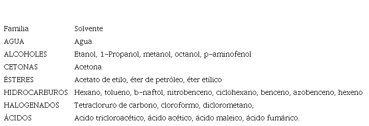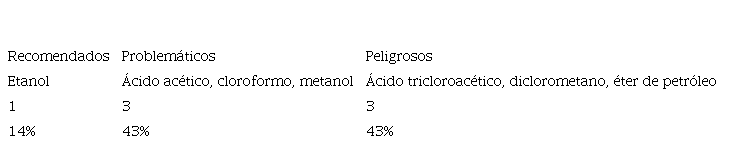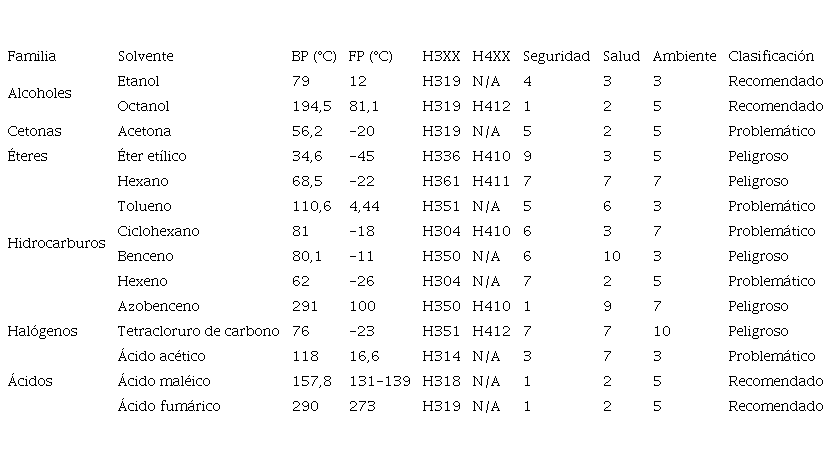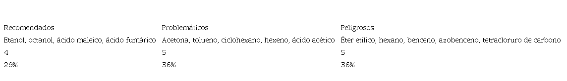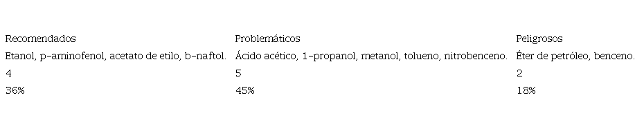 El 36% de los SO son clasificados como peligrosos (cuadro 11), entre los cuales se encuentran el éter etílico, hexano, benceno, azobenceno y tetracloruro de carbono, lo cual se debe a su alta inflamabilidad y a su bajo BP, a excepción del azobenceno, su clasificación obedece principalmente a su capacidad de generar cáncer. Las sustancias “problemáticas” son tolueno, ciclohexano, hexeno y ácido acético, esto debido a su volatilidad, inflamabilidad y en el caso de benceno, por su efecto cancerígeno. Finalmente, son categorizados como “recomendados” el etanol, octanol, ácido maleico y ácido fumárico.