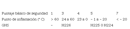 Se agrega un valor de 1 a la puntuación de seguridad para cada una de las siguientes propiedades:- AIT <200 ° C, - Resistividad> 10 8 Ω metro, Capacidad para formar peróxidos (EUH019) Cualquier disolvente con una alta energía de descomposición (> 500 J g - 1) como el nitrometano, se puntuaría 10. Fuente: [12].
