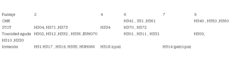 CMR: carcinógeno, mutágeno o reprotóxico. STOT: toxicidad en un solo órgano objetivo. ١ se agrega a la puntuación de salud si BP <٨٥ ° C. Fuente: [12].