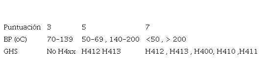 Un total de 5 son compuestos orgánicos altamente volátiles, con puntos de ebullición mayor a 60 oC, la única excepción es el ácido tricloroacético (temperatura de ebullición de 40) y el éter de petróleo que tiene un BP en un amplio intervalo (40-60 oC). Los valores de los puntos de ebullición le confieren al solvente la capacidad de difundirse en el ambiente afectado la salud de manera inminente [31]. Los valores del criterio de ambiente oscilan entre 3 y 7.