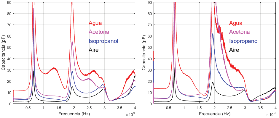 Además, en la figura 10 se muestran las capacitancias extraídas para las diferentes soluciones, utilizando dos prototipos del sistema distintos. Esto indica que las mediciones son reproducibles y se observa las mismas tendencias en la capacitancia extraída, a pesar de que la distribución de la capacitancia en función de la frecuencia puede variar debido a diferencias en el prototipo y las líneas de acceso. Se observa que el rango donde es más sencillo determinar diferencias entre las soluciones (por contraste capacitivo) está limitado a 2 GHz.