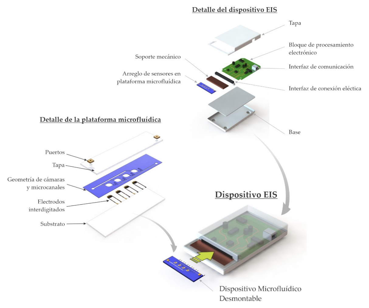 En este trabajo se aborda el proceso de diseño de un arreglo de sensores y la plataforma microfluídica que permiten hacer el proceso de transducción a pequeña escala para muestras en suspensión acuosa, desde su diseño conceptual, simulaciones multifísicas para su dimensionamiento y optimización, así como la fabricación y caracterización reológica y eléctrica. En la figura 1 se muestra el diseño conceptual con la integración de los componentes requeridos para implementar un sistema de EIS completo.