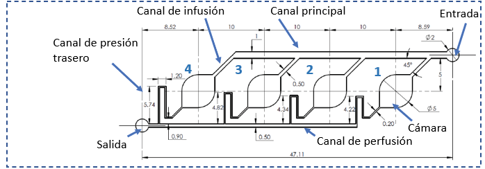 Para cumplir el requisito de que el dispositivo fuese de bajo costo, se decidió utilizar como substrato un portaobjeto estándar de vidrio con dimensiones de 26 mm x 76 mm x 1 mm, con la geometría final que se indica en la figura 2. El volumen total de fluido que puede alojar el dispositivo es de 19,01 µL y cada cámara de medición tiene una capacidad de 2,225 µL.