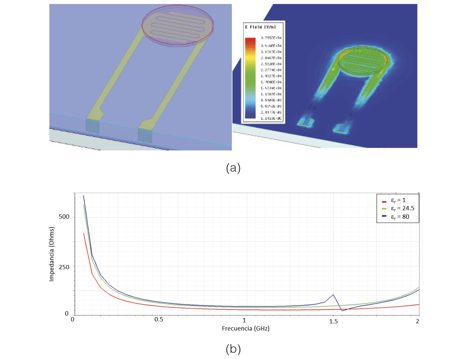 El proceso se acompañó en una primera fase por exhaustivos estudios a nivel de simulación con las herramientas Comsol Multiphysics, Ansys Fluent y Ansys Electromagnetic Desktop (HFSS). Con estas herramientas se hicieron estudios del comportamiento hidráulico de las cámaras y de los canales de transporte. En esos estudios se trabajó con la optimización de las dimensiones geométricas del sistema microfluídico con la meta de permitir el transporte homogéneo de fluido a lo largo de todo el canal de infusión y con ello el llenado completo de cada cámara, considerando magnitudes de presión, velocidad, esfuerzo cortante y líneas de flujo controladas. La figura 3 muestra la estructura base para cada cámara de sensado y el electrodo interdigitado final, así como la respuesta simulada de impedancia obtenida con la biblioteca de HFSS de ANSYS. El resultado obtenido muestra un comportamiento capacitivo, permitiendo distinguir materiales con diferentes constantes dieléctricas ubicados dentro de la cámara. Por las dimensiones del sensor, las líneas de acceso en el sensor y la tarjeta de interfaz ejercen un efecto para frecuencias en el rango GHz, las cuales se remueven por medio de una estrategia de extracción, asunto que se detalla posteriormente.