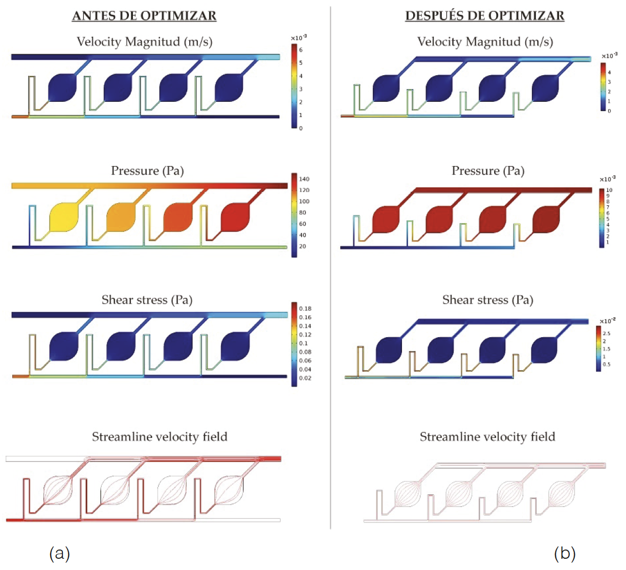 En la figura 4 se ilustra el proceso de optimización del balance del caudal en cada cámara, donde se muestran las distribuciones de velocidad, esfuerzo cortante y presión antes de optimizar (desiguales) y luego de su optimización (balanceadas). La optimización se desarrolló modificando la longitud del canal de salida de flujo de cada cámara, permitiendo que la resistencia dinámica resultante ajustara el balance requerido. Este detalle se puede observar en la figura 4, donde el resultado final (derecha) utiliza distintas longitudes en cada una de las cámaras. Así, la importancia del balance logrado radica en: 1) garantizar un llenado completo (sin burbujas) del dispositivo que podría alterar las mediciones de impedancia eléctrica y, 2) garantizar un mismo caudal a través de las cuatro cámaras en caso de que se desee realizar mediciones dinámicas en condiciones de flujo constante.