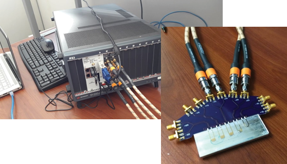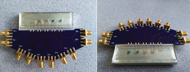 La interfaz de comunicación para conectar el arreglo de sensores y la microfluídica con el analizador de red vectorial (VNA de sus siglas en inglés, vector network analyzer) se realizó a través de una tarjeta de circuito impreso. Esta tarjeta se diseñó según características que permitieran la integridad en las mediciones en alta frecuencia. Entre estas características se tomó en consideración un diseño de pistas eléctricas con una impedancia característica de 50 Ω y con una distancia física de 44 mm para cada sensor desde el ingreso de la señal por el conector SMA (SubMiniature version A) hasta el punto de conexión con el electrodo. En la figura 6 se muestra la tarjeta de interconexión luego de ser fabricada y ensamblada. Para este sistema se utilizaron conectores SMA de alto desempeño en frecuencia para un rango máximo de 20 GHz. Para realizar la conexión eléctrica entre las pistas del PCB y los sensores se utilizó una resina epóxica conductora en base a partículas de plata (Pt).