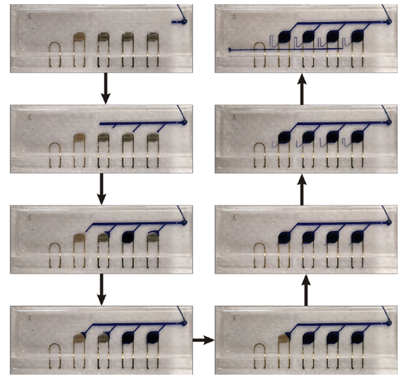 Para el procedimiento de llenado de las cámaras se utiliza un sistema bombeo que permite lograr un flujo de entrada constante regulable. Para la infusión del fluido muestra, se utiliza una velocidad o caudal no mayor a 0,02 µl/min; esto para evitar generar presiones elevadas en las distintas secciones que conforman el sistema de canales y cámaras del sistema microfluídico. Este proceso de llenado de cámaras se puede visualizar en la imagen de la figura 8.