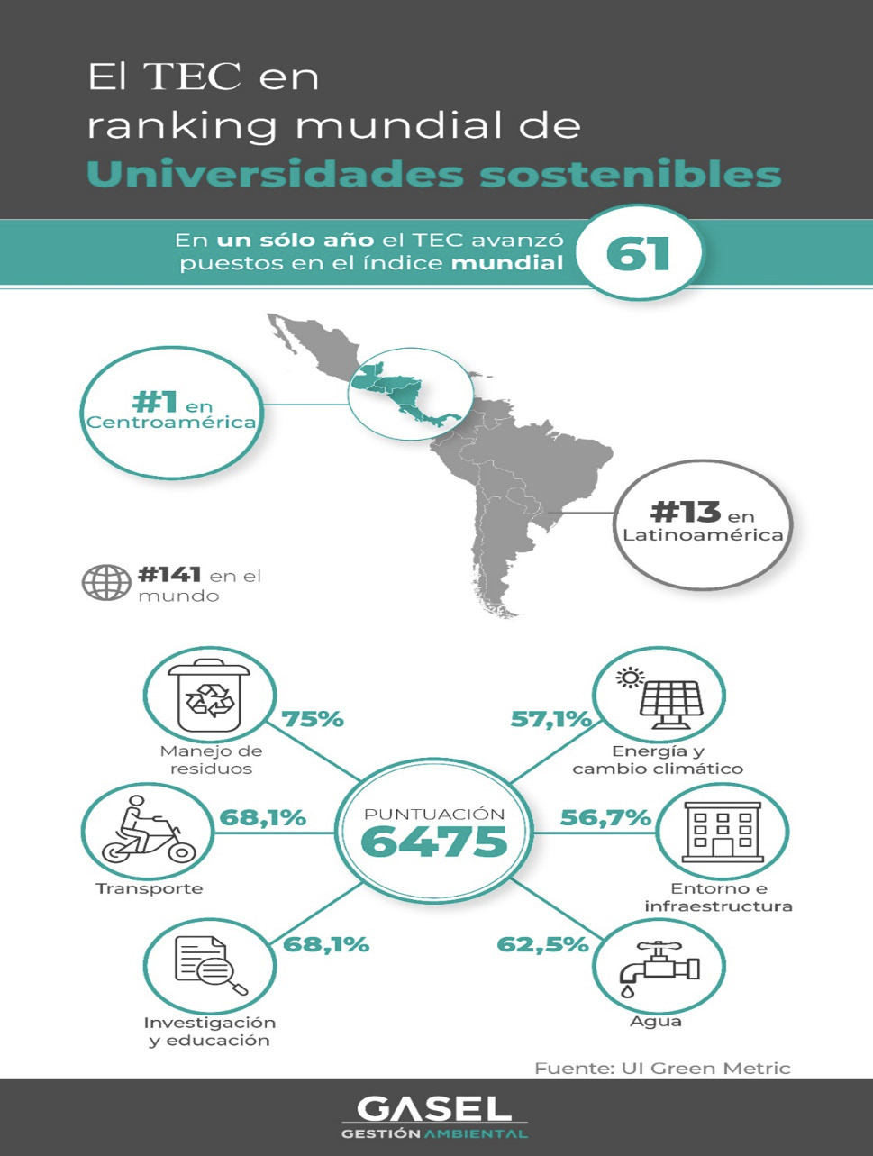 Es así como el Instituto Tecnológico de Costa Rica (ITCR), universidad nacional autónoma de educación superior, se suma a los esfuerzos del país en materia ambiental, donde a través de la Unidad Institucional de Gestión Ambiental y Seguridad Laboral (GASEL) participa en el desarrollo de proyectos que buscan promover la sostenibilidad dentro y fuera del campus universitario. Por esta razón aplica en el año 2019, en el Ranking Mundial de Universidades UI Green Metric.