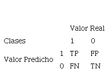 Los resultados obtenidos en la etapa de prueba son representados mediante una matriz llamada Matriz de Confusión [25]. Para comprender de mejor forma esta matriz, se considera solo dos clases: la clase 1 que correspondería a una calidad adecuada y la clase 0 que correspondería a una calidad inadecuada (sobre o bajo el estándar) [26]. La Matriz de Confusión tiene la forma que se muestra en el cuadro 1. En la Matriz de Confusión mostrada en cuadro 1, Tp representa los elementos de la clase 1 correctamente predichos por el modelo y Fn representa los elementos de la clase 1 incorrectamente predichos por el modelo (Error Tipo I). Tn representa los elementos de la clase 0 correctamente predichos por el modelo y Fp representa los elementos de la clase 0 incorrectamente predichos por el modelo (Error Tipo II). La Matriz de Confusión, permite obtener las siguientes medidas de desempeño: