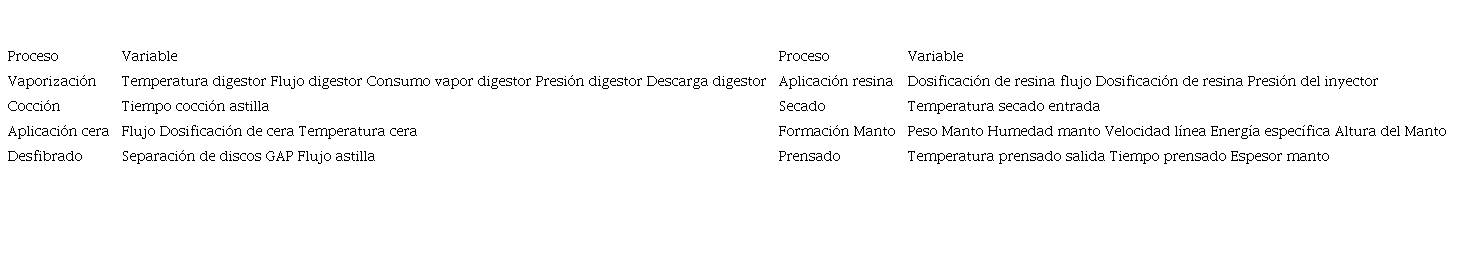 La empresa no cuenta con un sistema unificado con el registro de las variables del proceso. La unificación de estas variables se realizó en forma manual, estableciendo como identificador de cada registro la fecha y hora en que se prensó cada revestimiento. Se identificó con la ayuda de expertos 22 variables que generan un impacto en la calidad de los revestimientos las cuales se muestran en el cuadro 2. Se consideró el mes como una variable adicional, debido a que características ambientales asociadas a cada mes, como temperatura y humedad, podían influir en las propiedades físicas de la astilla de madera, considerada el principal insumo productivo.