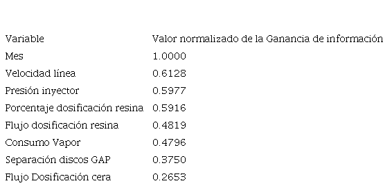 Para identificar las variables más importantes, se mide el poder predictivo de cada uno de ellos, sobre la variable categorizada de calidad. Se selecciona aquellas variables con mayor poder predictivo para el entrenamiento de los modelos [29]. Para medir el poder predictivo de cada variable, se utilizó el método de la Ganancia de Información. La ganancia de información mide la parte de la información contenida en una variable que explica la variable a predecir. A mayor ganancia de información más importante es la variable para la predicción. Para medir la ganancia de información de cada variable fue necesario categorizar las variables numéricas del proceso. Las categorías se definieron en tres rangos de igual amplitud, que representan tres magnitudes de las variables: alta, media y baja. Luego se seleccionó entre todas las variables aquellas con un valor de ganancia de información mayor o igual al promedio 0.2320 [30]. El cuadro 4 muestra las variables seleccionadas y el valor normalizado de la ganancia de información de cada variable en orden descendente.