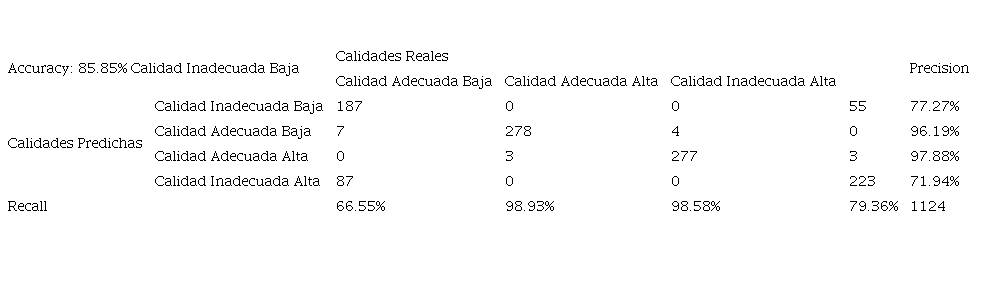 La predicción generada por un algoritmo de machine learning para el conjunto de prueba es un valor entre cero y uno para cada una de las cuatro categorías de la variable calidad. Este valor es conocido como confidence. Un confidence más cercano a 1 representa una mayor probabilidad de que un registro pertenezca a una determinada calidad, por lo que la calidad asignada a un registro será aquella que presente un mayor valor. En base a esto se obtuvo la matriz de confusión para cada algoritmo de machine learning entrenado. El cuadro 5 muestra los resultados de la predicción de la calidad del algoritmo Neuronal Net.