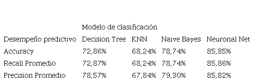 En el cuadro 6 se muestran los valores de Accuracy, Precision y Recall, de cada uno de los algoritmos entrenados. Se observa que el algoritmo Neural Net presenta los valores más altos en cada una de las medidas de desempeño.