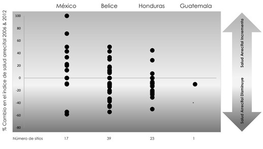 Este sistema no se encuentra ajeno a los factores mencionados con anterioridad, observándose una gran pérdida en la cobertura coralina, algunos estudios de salud realizados al sistema mencionan que su situación no mejora, que en cambio presenta una tendencia al declive (figura 2) [6], [14]. Un ejemplo del deterioro en un arrecife se ve reflejado durante un estudio realizado por Caballero et. al. en 2009, en Bahía de Cochinos, Cuba; en donde mencionan que han encontrado una dismunución de hasta un 25% en el indice de biomasa, pérdidas de más de 2 ejemplares/m2 y alteraciones en el patrón de dominancia de especies de esponjas (organismos que viven en comunidad con el arrecife) [10]. Jackson en 2014 menciono que los arrecifes del Golfo de México y varios arrecifes del Caribe aún manifiestan bajos valores en cobertura coralina, que se atribuyen a la frecuencia de perturbaciones naturales y de origen humano [15].