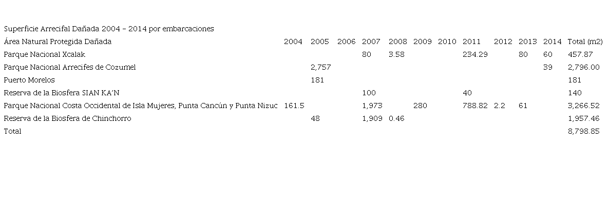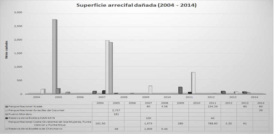 Estas áreas presentaron en un periodo de 2004 a 2014 una serie de encallamientos que causaron daño a los sistemas arrecifales, así como también en zonas costeras de arenas y pastos marinos. El total de superficie arrecifal dañada causado por las embarcaciones dentro del periodo de 2004 – 2014 fue de 8,798.85 m2; en la Tabla 1, mostramos por cada área natural protegida la superficie dañada a lo largo de los 10 años.