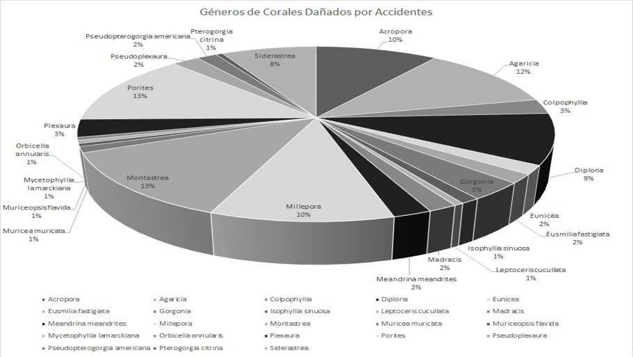 Para conocer la proporción de los daños, se identifican y registran las especies3dañadas, tanto de corales duros como blandos, estos se segmentaron en géneros, aunque se presentan algunas especies en particular, dentro de los géneros más dañados se encontraron Porites, Montastrea (registrado en la NOM-59-SEMARNAT-2010), Agaricia, Millepora, Acropora, Diploria y Siderastrea. La figura 5 describe los daños por género de los corales.