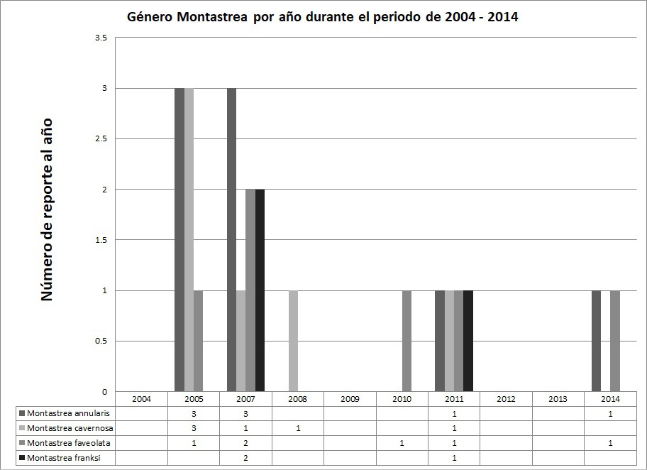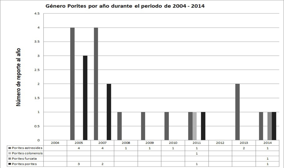 Si comparamos los géneros que presentaron mayor afectación Montastrea y Porites (13% cada uno) durante el periodo analizado, se encuentra que a pesar de ser géneros representativos estos difirieron en la presencia de daño siendo que Montrastrea solo se presentó en 5 años mientras que el género Porites se presentó en 8 de los 10 años (figuras 6 y 7). Además, el género de Porites astreoides es el que se ha reportado en más ocasiones.