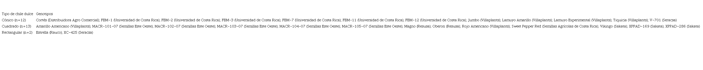 El ensayo se llevó a cabo en un invernadero modelo XR de la marca Richel (Francia), tipo multicapilla, de plástico, con ventilación cenital automática. Se evaluaron 27 genotipos híbridos de chile dulce (Capsicum annuum L.) (cuadro 1), correspondientes a tres tipos, según la forma del fruto: cónico (12 genotipos), cuadrado (13 genotipos) y rectangular (2 genotipos).