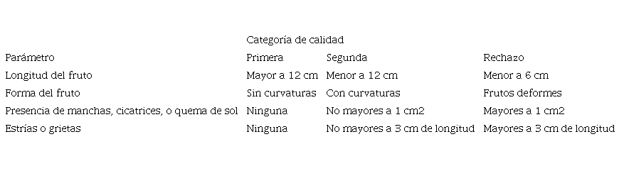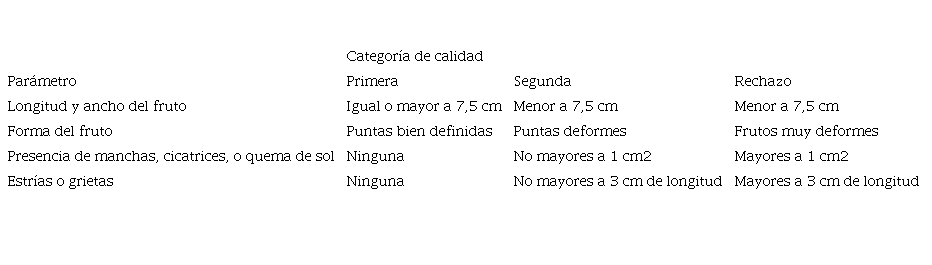 La cosecha se realizó del 1° de noviembre de 2010 al 14 de abril de 2011, y se realizó un total de 20 cosechas, las cuales se efectuaron semanalmente recolectando todos los frutos con un 50 % de madurez mínima. Los frutos se clasificaron en tres categorías de calidad (primera, segunda y rechazo), de acuerdo a diversos parámetros, según el tipo de chile dulce (cuadros 2 y 3).