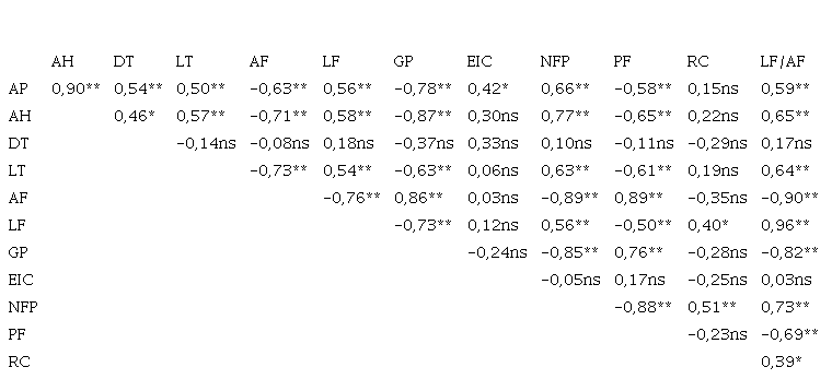 La correlación encontrada entre AF y NFP fue negativa y altamente significativa (r = -0,89**); otros autores también hallaron una correlación negativa, y significativa o altamente significativa, entre dichas variables (r = -0,21 a -0,62) [26][16][11][7][10]. Sin embargo, en otros estudios dicha correlación fue positiva, y significativa o altamente significativa (r = 0,17 a 0,65) [17][21][23][15][3]; y en otros casos esta correlación no fue significativa [9][27][6][2][5][1][24] [22][20][19].