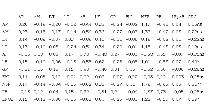 En el cuadro 5 se presentan los coeficientes de correlación de Pearson (r), entre las variables evaluadas. De las 66 correlaciones de Pearson calculadas, 24 de ellas fueron no significativas, 4 fueron significativas (p≤0,05), y 38 fueron altamente significativas (p≤0,01). Por su magnitud, sobresalen las correlaciones obtenidas entre: LF y LF/AF (r = 0,96**); AF y LF/AF (r = -0,90**); AP y AH (r = 0,90**); AF y PF (r = 0,89**); AF y NFP (r = -0,89**); NFP y PF (r = -0,88**); AH y GP (r = -0,87**); AF y GP (r = 0,86**); y GP y NFP (r = -0,85**).