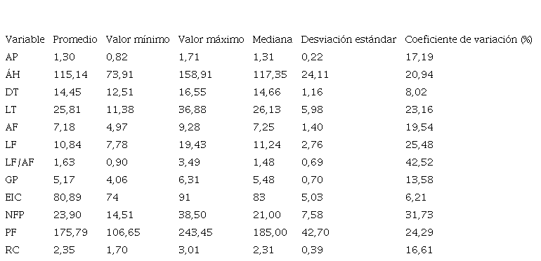 En el cuadro 4 se muestra el resumen estadístico de los valores obtenidos para cada una de las variables estudiadas. Sobresale el alto coeficiente de variación obtenido por LF/AF (CV = 42,52%) y NFP (CV = 31,73%); las otras variables que también mostraron una variabilidad importante de los datos fueron LF (CV = 25,48%), PF (CV = 24,29%), LT (CV = 23,16%) y AH (CV = 20,94%).