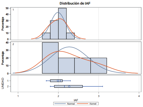 The value of t was -1.76, obtained from the comparison of means of the leaf area index in the two sampling units, and taking with reference the values of TT = ± 2.2622, they show that there is no statistically significant difference, so that statistically the values of the leaf area index are equal, a mean of 2.0 was obtained (figure 3).