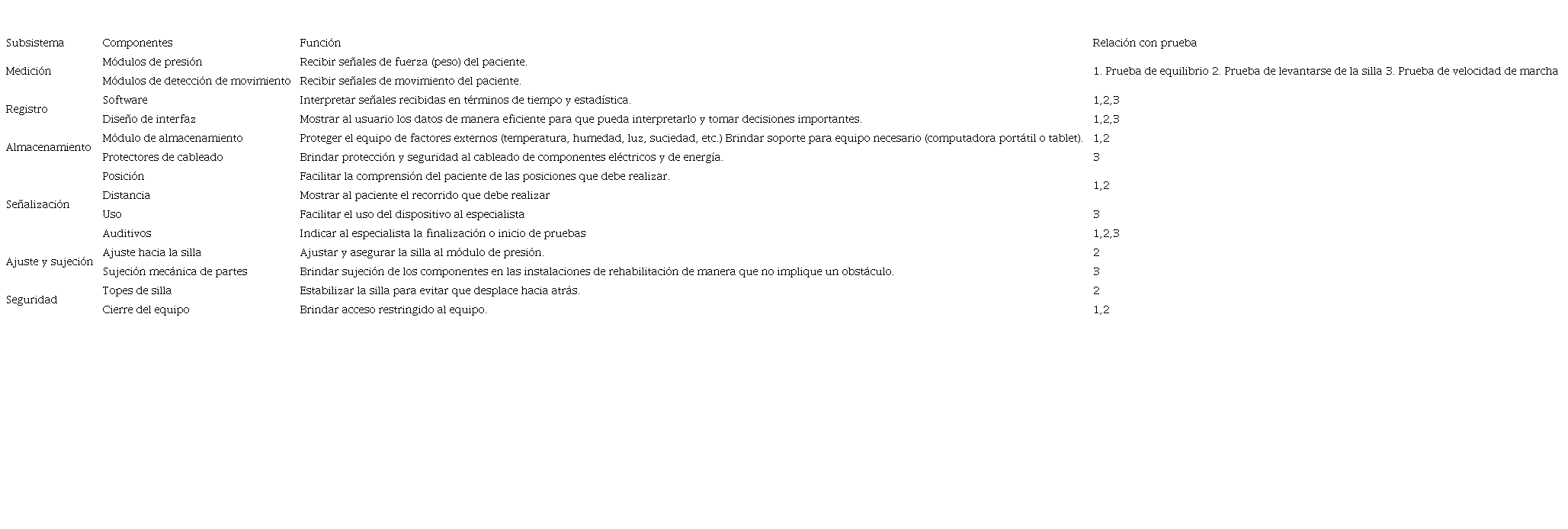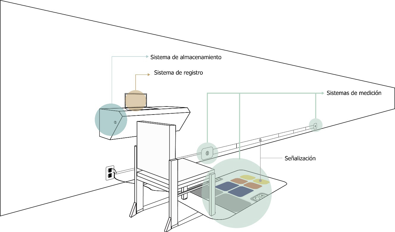 Otros sistemas incluyen el almacenamiento del equipo, el cual sirve como protección para guardar el tapete instrumentado y accesorios (tope de seguridad para la silla y cargador del tapete) y como apoyo para la computadora o tablet que brinda el control para elegir las pruebas y visualizar los datos en tiempo real. Los elementos de señalización permiten mostrar con facilidad al adulto mayor las áreas en donde tiene que posicionarse y el camino a recorrer. Además, le da facilidad al especialista para dar las indicaciones al referirse a los elementos visuales de posición, distancia y uso del sistema. La señal auditiva, permite conocer la finalización del cronómetro entre pruebas. Los subsistemas de ajuste y sujeción son diseñados de manera que sean fáciles de manipular (el tapete hacia diferentes formas de sillas) y se puedan sustituir en caso de necesitarlo (elementos estándares como tornillos, canaletas, etc).