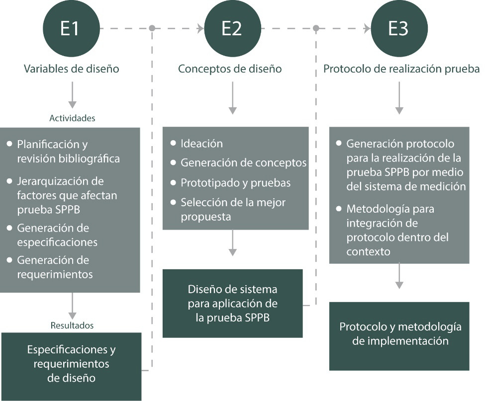 Este estudio muestra el diseño de un sistema de medición que apoya la labor de los especialistas geriátricos al aplicar la prueba Short Physical Performance Battery (SPPB) para conocer el desempeño funcional del adulto mayor. La prueba SPPB consta de tres subpruebas que miden variables de fuerza de piernas, equilibrio y velocidad de marcha. Es una prueba de screening o diagnóstico rápido para establecer, junto a otras evaluaciones, el estado de fragilidad de un adulto mayor, por medio de la sumatoria del puntaje obtenido en cada subprueba de acuerdo a una escala de tiempo. La fragilidad se relaciona con la discapacidad, comorbilidad y eventos adversos como la muerte por lo que aplicar esta prueba es una manera de detectar, clasificar y planificar las intervenciones adecuadas al paciente. Como todas las pruebas de desempeño corto, la SPPB se aplica de manera manual con la única ayuda de un cronómetro digital comúnmente utilizado en un reloj de pulsera o en el teléfono celular. Por medio de las observaciones y entrevistas se establecieron varios factores que afectan la aplicación de la prueba y los puntajes en cada subprueba y, por lo tanto, la clasificación del adulto mayor en un estado específico de fragilidad. Esto genera incertidumbre en la fiabilidad de los datos e impacta directamente en el estado físico real del paciente. Además, dichos factores influyen en el tiempo de aplicación de la prueba y perjudica el tiempo de consulta destinado para cada paciente de 30 minutos. Es por esta razón que se identifica la oportunidad de implementar recursos tecnológicos para mejorar el tiempo de aplicación de la prueba y la fiabilidad de los datos, por medio del diseño de un sistema de medición, un protocolo para la aplicación de la prueba y una propuesta metodológica para implementarla en centros de rehabilitación.