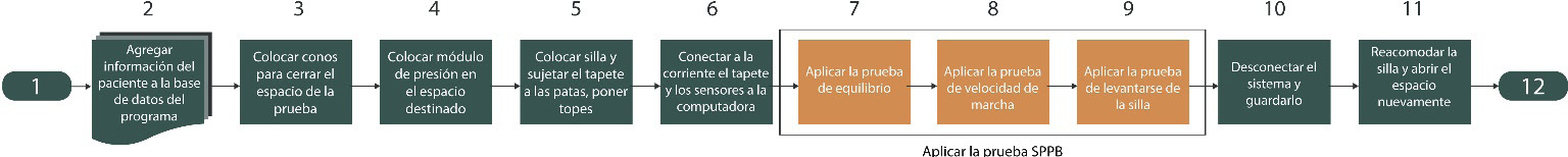 El uso de tecnología en un proceso de valoración funcional no es común dentro de la práctica geriátrica. Es por ello, que al implementar recursos tecnológicos dentro de una prueba de desempeño físico aplicada de manera manual es necesario establecer pautas e instrucciones para que la aplicación de la prueba SPPB, por medio del sistema de medición en centros de salud como el HBC, sea efectiva. Para realizar el protocolo de incorporación tecnológica se utilizaron como referencia diagramas de flujo que permitieron observar y analizar la aplicación de la prueba con el uso de la tecnología se pudo comprobar la eliminación de reprocesos con respecto a la aplicación actual como la explicación inicial de las posturas, recolocación del adulto mayor en el espacio, finalización de cronómetros, registro de puntajes o errores en la medida por tiempos de reacción lenta y uso del cronómetro. Actividades que son sustituidas o mejoradas por la tecnología. Otro beneficio del sistema es la aplicación de la prueba en un solo lugar, lo que elimina traslados a otros espacios (para aplicar la prueba de velocidad).