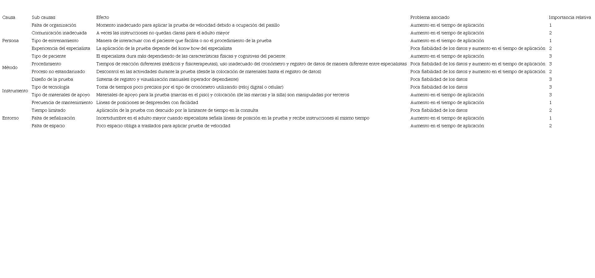 De acuerdo al problema planteado de poca fiabilidad de los datos y tiempos de aplicación de la prueba y después de un análisis de puntos críticos para cada sub prueba con el fin de definir los principales reprocesos en la aplicación de la prueba SPPB, se establecieron las causas y sus efectos respectivos (cuadro 1).