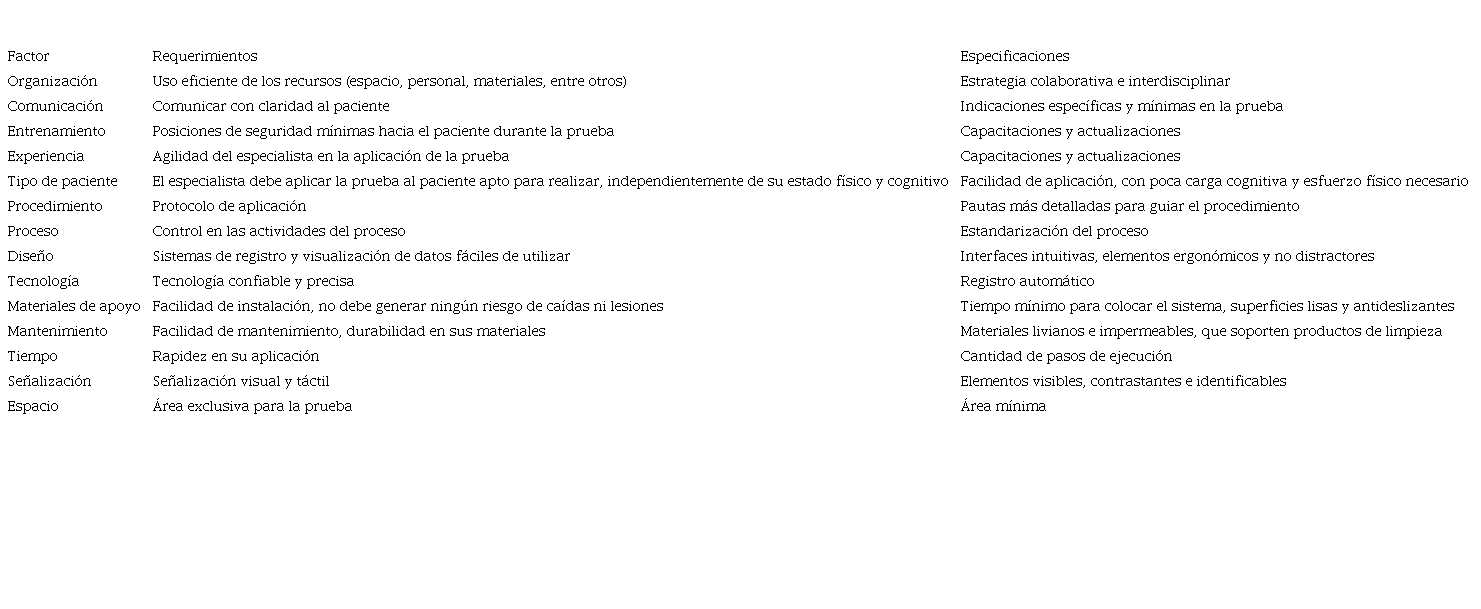 Esto quiere decir que, el especialista debe de aplicar la prueba con facilidad, sin ninguna sobrecarga de información o distracción causada por información innecesaria. Además, el sistema deber contar con un protocolo detallado del procedimiento para evitar incurrir en el mal uso del instrumento de medición, evitar tiempos de reacción que perjudiquen la medición o datos con un registro incorrecto. Para ello el sistema de registro y visualización de datos debe ser intuitivo y que no le demande al especialista mayor intervención. Adicional a este requisito, el sistema debe permitir un acceso a la información posterior a la prueba con el fin de observar la evolución del estado físico del paciente. La tecnología que se implemente para la medición del tiempo debe restringir el error humano y el tiempo de reacción del especialista. Un registro automático permite que el especialista solo se preocupe por la seguridad del paciente durante la prueba. Finalmente, los materiales que apoyen la prueba deben ser seguros para el paciente y de fácil colocación, al mismo tiempo que impidan la manipulación por terceros antes o durante la prueba. Los requerimientos de segundo y tercer nivel están detallados en el cuadro 2.