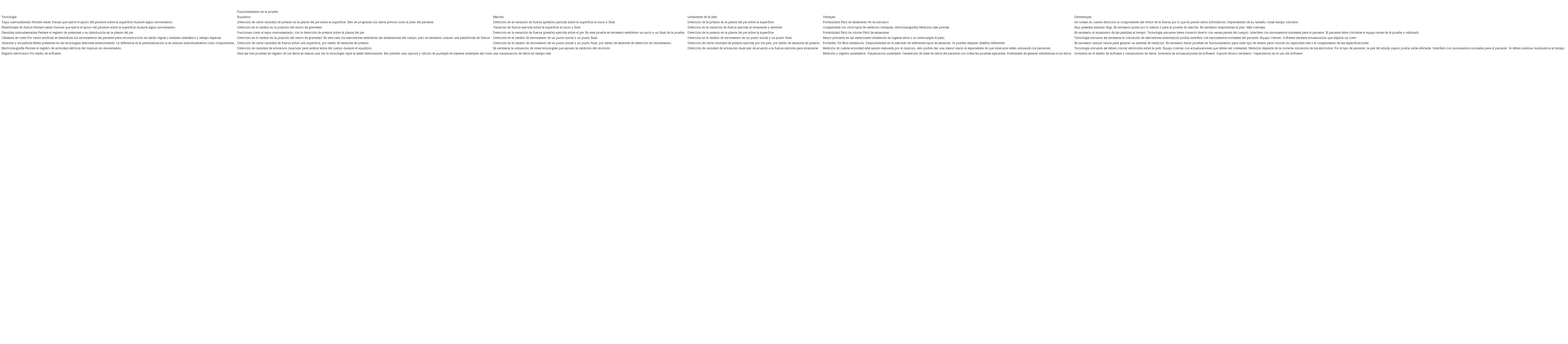 Se realizó un análisis de las tecnologías existentes en el mercado que puedan realizar mediciones cinéticas y cinemáticas, con el fin de facilitar la toma de datos en un tiempo determinado. Se puede observar en la tabla 3 un resumen de las tecnologías propuestas, así como sus ventajas y desventajas. La selección y conveniencia del tipo de tecnología a desarrollar se estableció de acuerdo a las necesidades, requerimientos y especificaciones planteadas, es por esta razón que se seleccionaron los sistemas de tapiz instrumentado y plataforma de fuerza con la utilización de sensores y actuadores para el diseño del sistema de medición. El factor tipo de paciente descartó las tecnologías que deben colocar o ajustar algún elemento al adulto mayor (plantillas instrumentadas, cámaras de video y electromiografía). Esto para resguardar la seguridad del adulto mayor (posibles lesiones sobre la piel) y evitar que los elementos puedan caerse por un mal ajuste. Finalmente, el registro electrónico, si bien es una opción tecnológica que viene incorporada con algunos de estos sistemas, la opción de diseñar y proponer una mejor visualización de datos generales y estadísticos, así como la conexión con otros programas utilizados por los sistemas de salud (EDUS o privados) es de considerar separadamente.