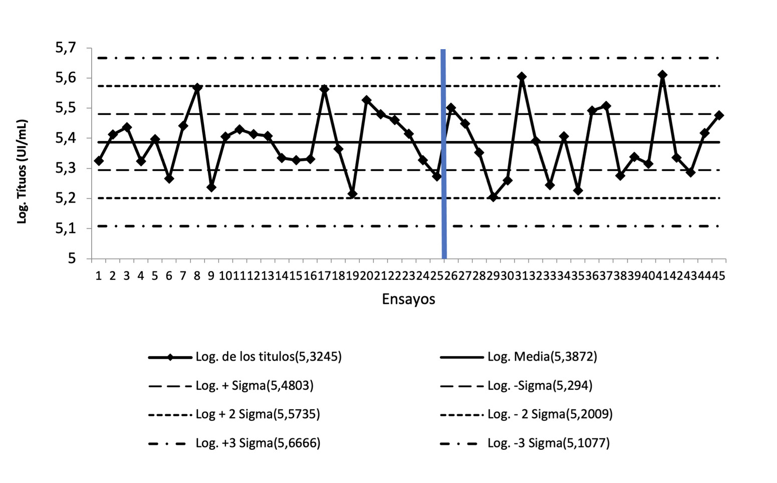 Los gráficos de control constituyen una herramienta para asegurar que los ensayos se mantienen bajo control estadístico. Un requisito indispensable para tomar los ensayos como válidos es que el valor de potencia obtenido para los controles positivos se encuentre entre las ±3 DS (Desviación estándar) [59]. Otra condición que indica que el ensayo se encuentra bajo control estadístico es el comportamiento de los valores de potencia obtenidos de los controles [4]. Estos se construyen tomando en cuenta los valores de potencia biológica del fármaco evaluado obtenidos en ensayos en años anteriores y comparándolos con los valores actuales. El objetivo principal es asegurarse de que el comportamiento de la actividad biológica del fármaco se encuentra dentro de los límites establecidos (±3 DS del valor medio reportado)