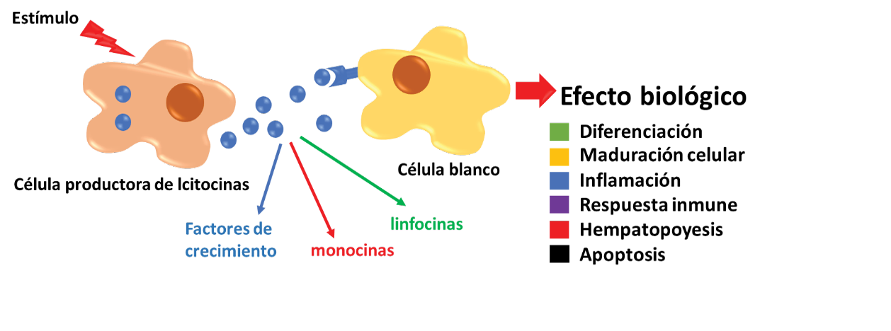 Las citocinas son un grupo de proteínas de rápido crecimiento que controlan el mantenimiento y la actividad del sistema inmune [12]. Las cuales presentan un amplio rango de actividad biológica sobre un gran número de tipos de células, sobre las cuales pueden inducir proliferación, diferenciación y maduración (figura 1) [1, 2]. Estas moléculas pueden ser producidas principalmente por células dendríticas y fagocitos mononucleares [1] y actúan en vivo en un gran complejo de proteínas interactuantes para lograr el control del sistema inmune [13]. Diferentes células pueden secretar la misma citocina, y solo una de estas moléculas puede afectar severamente distintos tejidos; esta propiedad es llamada pleiotropía [14].