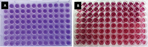 Figura 2. Placas de 96 pocillos reveladas con Cristal Violeta (A) y MTT (B). En este diseño, se colocó una mayor concentración de citocinas en los pocillos superiores, por lo cual se observa una disminución de la proliferación celular en los pocillos inferiores.