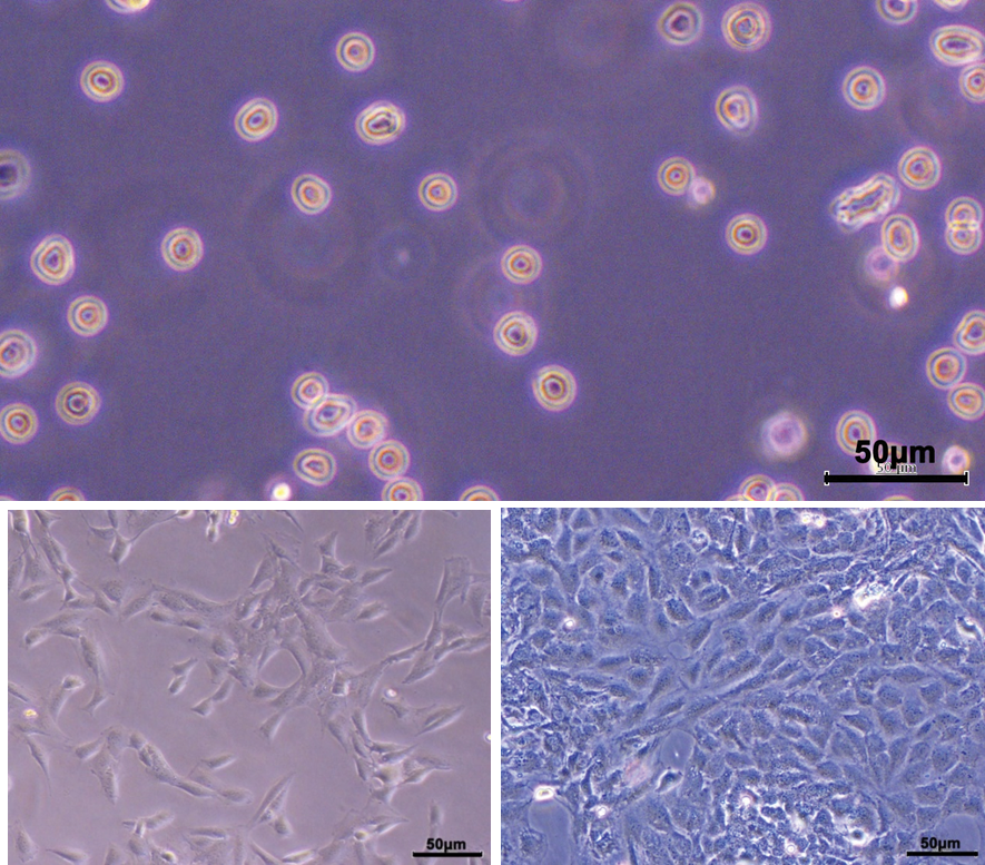 En muchos ensayos biológicos para el control de citocinas, se utilizan células de anclaje (se adhieren a la superficie del frasco), por tanto, se necesita una enzima que pueda escindir las proteínas de unión para poder expandir y realizar el conteo. Para esto se utiliza la tripsina, una enzima que rompe enlaces peptídicos en las proteínas de adhesión [50]. Debido a esto, las células quedan en suspensión con una forma redondeada y con diferente morfología (figura 3). Es importante tener en cuenta que, la acción de la tripsina durante un tiempo prolongado de exposición provoca la muerte celular, lo cual crea la necesidad de una buena manipulación de los cultivos para que no ocurran daños morfológicos y detritos celulares [48].