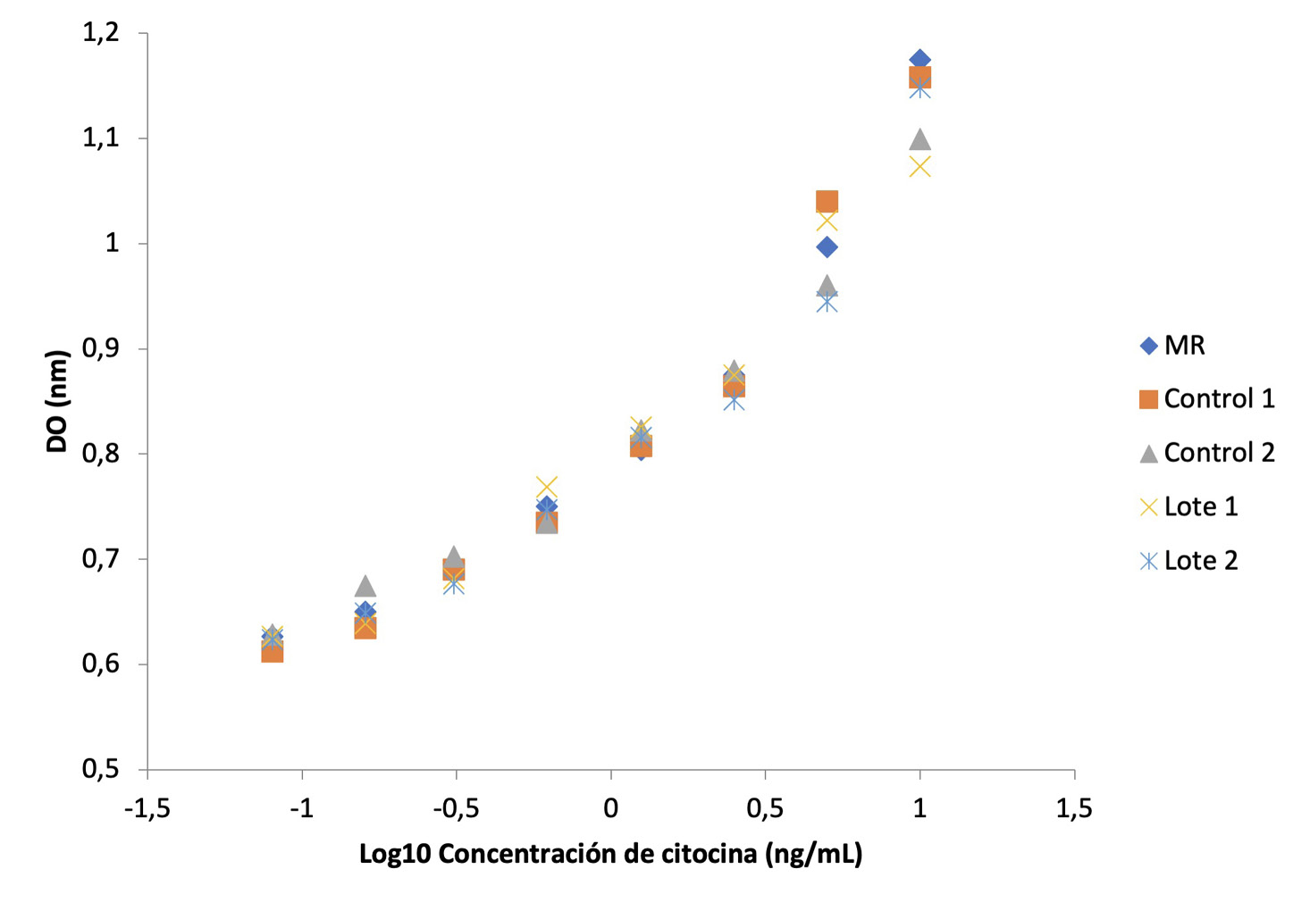 Figura 4. Curva dosis-respuesta obtenida en un EB in vitro donde se observa el comportamiento del fármaco (Lote 1 y 2), el Material de Referencia (MR) y Controles Positivos 1 y 2.
