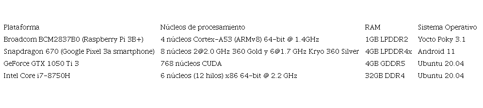 El ambiente de pruebas se ejecutó en cuatro plataformas, un Google Pixel 3a, una Raspberry Pi 3B+, una GPU de NVIDIA y un procesador Intel x86. Se usaron los siguientes kits de desarrollo de software (SDK, por sus siglas en inglés) según la plataforma: Android NDK, Yocto Poky, CUDA y la cadena de herramientas GCC.