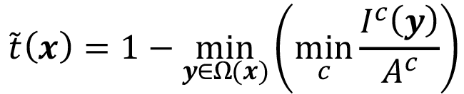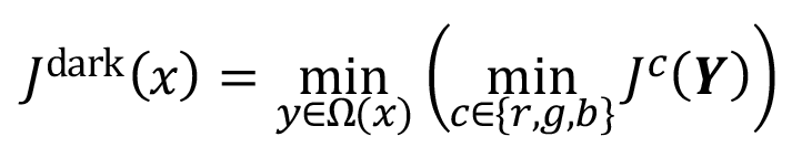 es la transmisividad del medio, este modelo resulta en un sistema de ecuaciones indeterminado, con 3N variables conocidas y 4N + 3 incógnitas [4]. Para lograr resolver el sistema, a partir de una imagen arbitraria Y, se determina su canal oscuro (DCP) o Jdark como se muestra en [4].