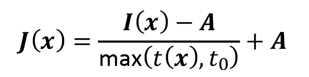 Donde Jdark es una imagen en escala de grises, se escoge el 0.1% de pixeles con mayor intensidad. Utilizando la posición de los pixeles seleccionados, se selecciona el color que tenga la mayor intensidad en la imagen original, este color corresponde a A. Luego se calcula una aproximación de